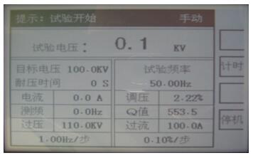 注意:手動控制加壓,不能快速旋轉(zhuǎn)調(diào)壓,調(diào)頻旋鈕,并選擇適當(dāng)?shù)牟竭M值以免系統(tǒng)高電壓快速變化,產(chǎn)生過壓,對被試品,試驗系統(tǒng)產(chǎn)生危害