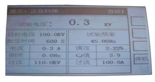 此時調(diào)節(jié)頻率旋鈕尋找諧振點(尋找掃頻過程中某一點的最高電壓值,并且“測頻”的頻率值應(yīng)與試驗頻率接近)諧振點找到后調(diào)節(jié)電壓旋鈕開始升壓。