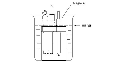 (3).如仍不能拆卸,請將滴定池放入2升的燒杯中,慢慢加入濃度為5%的氯化鉀溶液侵泡,其液面位置見圖十四,必須十分注意,不要讓測量電極﹑陰極室電極的引線套端頭進(jìn)入液體,侵泡約十幾小時(shí)或24小時(shí)后,即可拆卸(此方法可重復(fù)進(jìn)行)。
