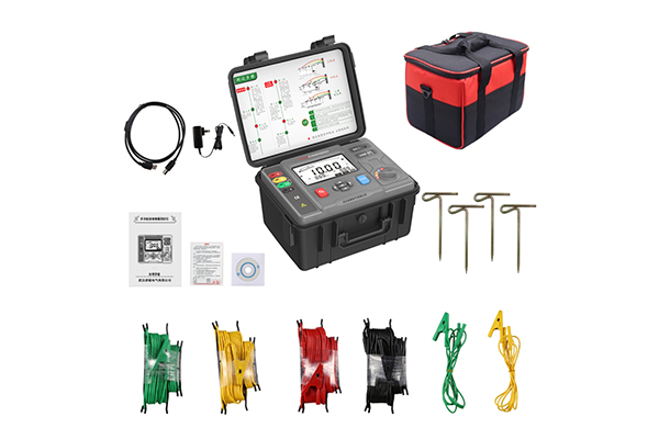 多功能接地電阻測試儀由主機、上位機軟件、手機APP軟件、測試線、USB線、充電器、接地針組成。