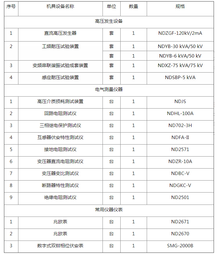 承裝(修、試)承試類四級電力設施許可證所需施工機具設備選型如下: